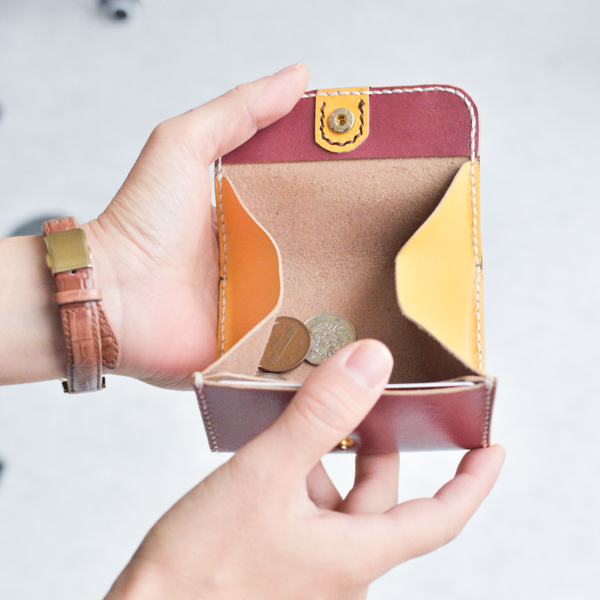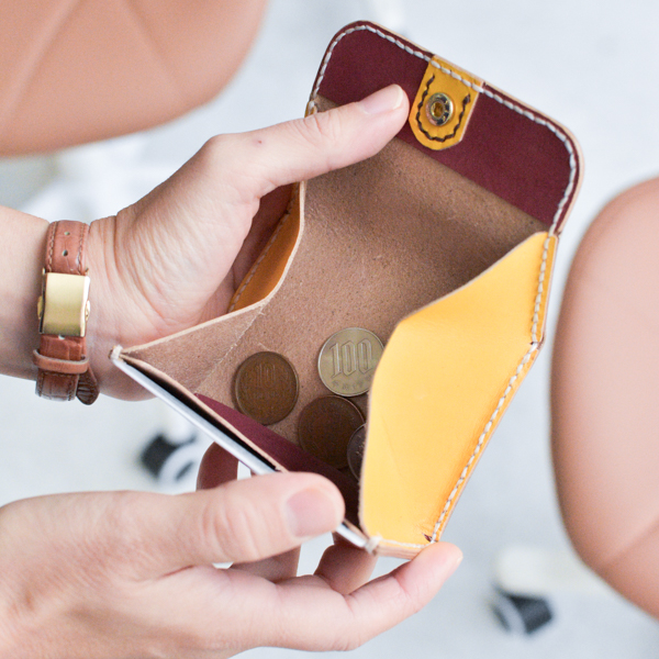 ボタンをぱちんと外すと、思わず笑顔になるお芋カラーの内側が登場。落ち着いた紺色とのコントラストが楽しく、バッグの中でも見つけやすいのがうれしいポイント。毎日の支払い時間が、ちょっとした癒しの時間に変わります。