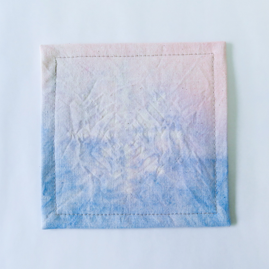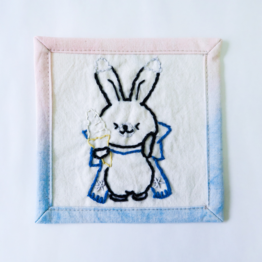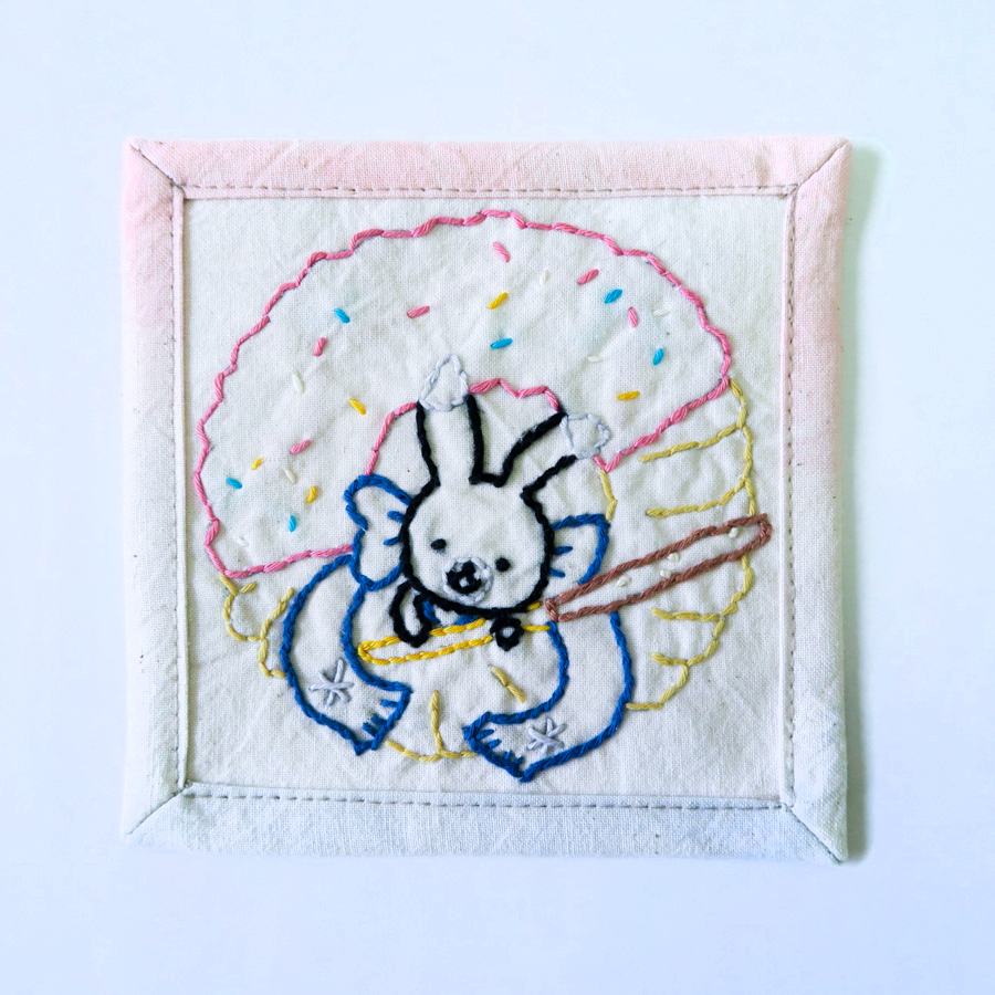 コースターの表面と裏面の枠部分には、雪の結晶を思わせる刺し子模様を施し、ユキネのマフラーをイメージした青色、そして今年のテーマ「しあわせパティスリー」から連想したピンクを重ね、美しいグラデーションになるよう丁寧に染め上げています。
